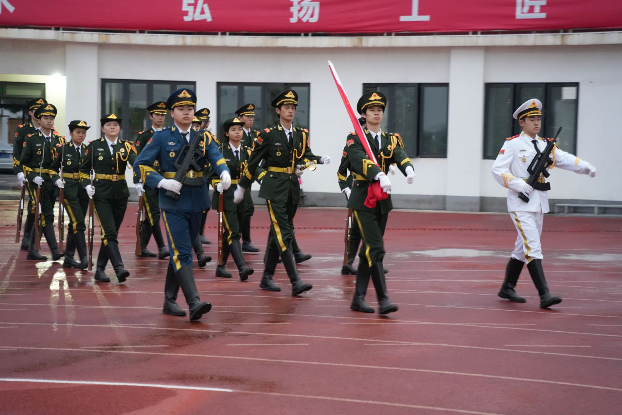 清晨,国旗护卫队队员们昂首阔步,护卫五星红旗入场。伴随着《义勇军进行曲》奏响,全体师生肃立,向国旗行注目礼,鲜艳的五星红旗在校园上空冉冉升起。